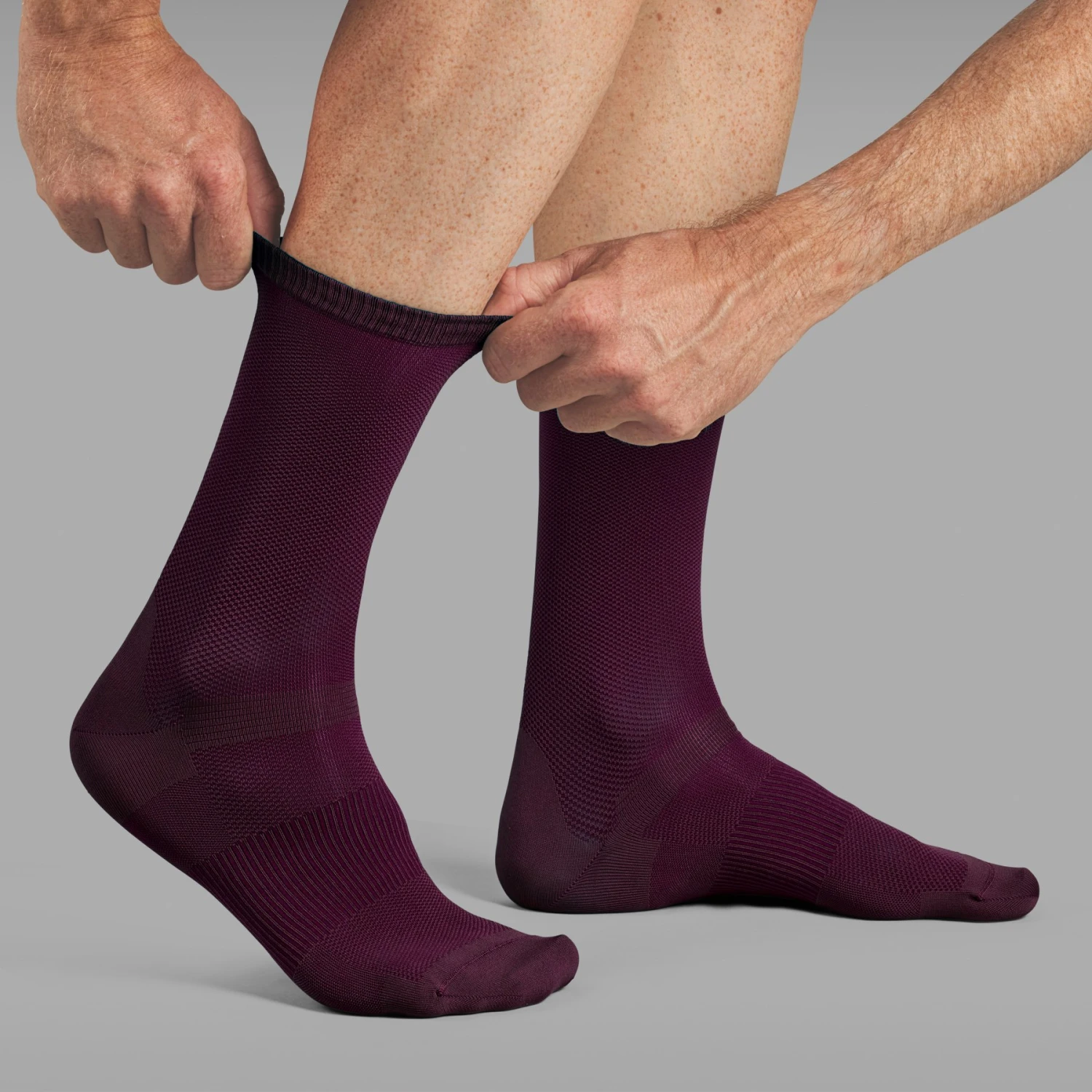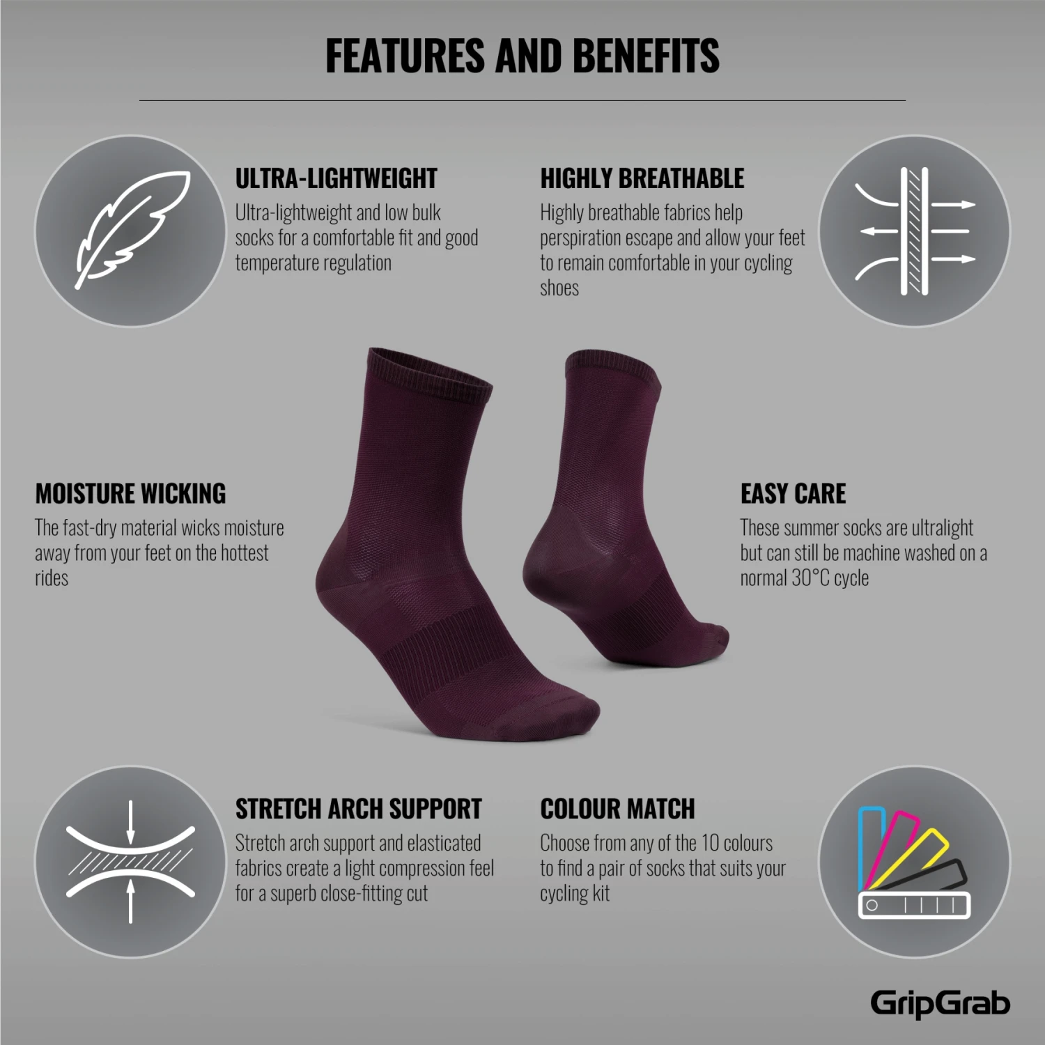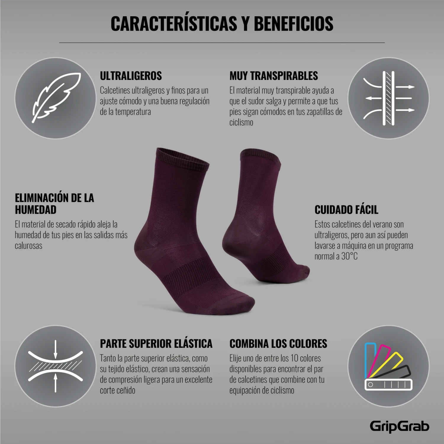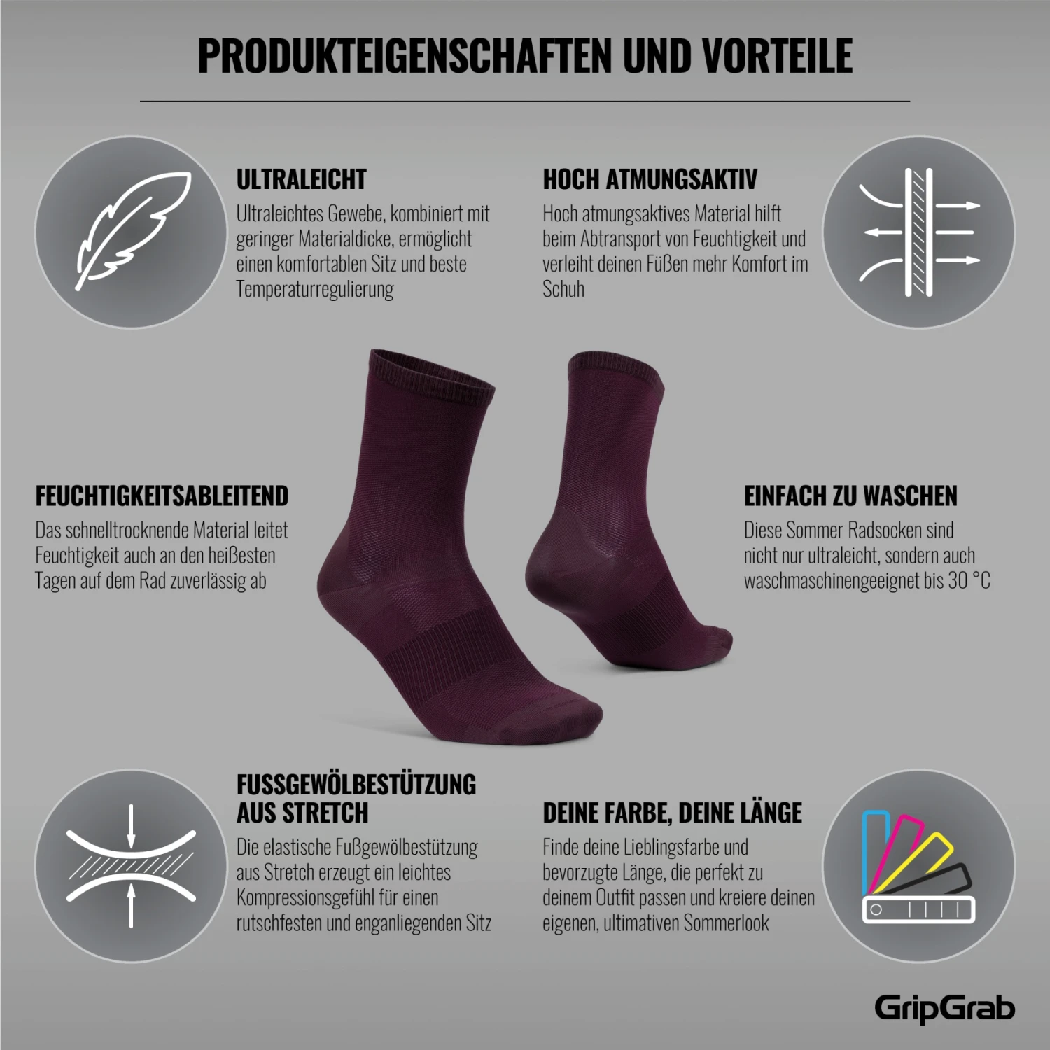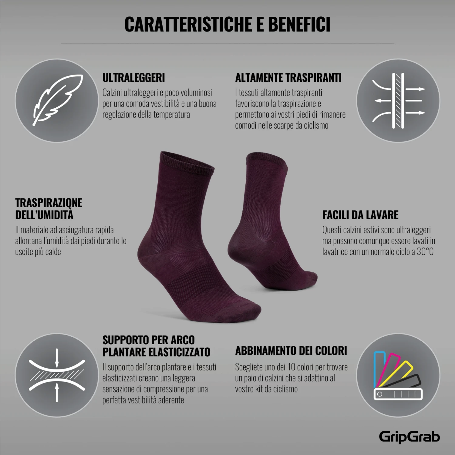 Die GripGrab Lightweight Airflow Socken sind der ideale Begleiter im Sommer und an warmen Tagen auf dem Rad – sie sind deine erste Wahl, wenn die Sonne den Asphalt zum Schmelzen bringt und der Anstieg vor dir nicht enden will.Die hoch atmungsaktiven Airflow Open-Mesh Zonen ermöglichen eine außergewöhnlich gute Luftzirkulation, während die Coolmax® EcoMade Faser Technologie Feuchtigkeit von deiner Haut optimal abtransportiert und temperaturregulierend wirkt.Designt mit einer eng sitzenden Fußgewölbestützung aus Stretch, vereinen diese Radsocken Performance und Komfort.Wenn du auf dem Bike alles gibst, sollte dir deine Bekleidung dabei nicht im Weg stehen. Die GripGrab Lightweight Airflow Socken sind dank ihrer federleichten Konstruktion kaumspürbar und du kannst dich voll auf den nächsten KOM oder die wunderschöne Landschaft konzentrieren.Dank des dezenten Logos und der Auswahl zwischen 10 verschiedenen Farben komplettieren die GripGrab Lightweight Airflow Socken jedes bestehende Outfit oder GripGrab Accessoire.