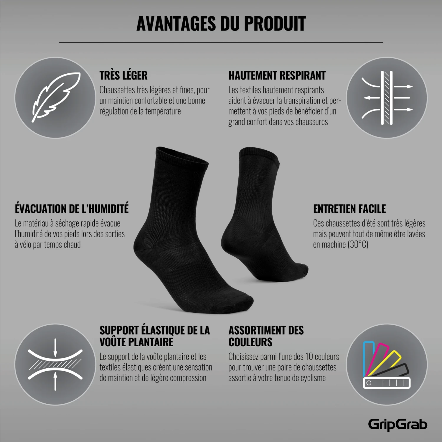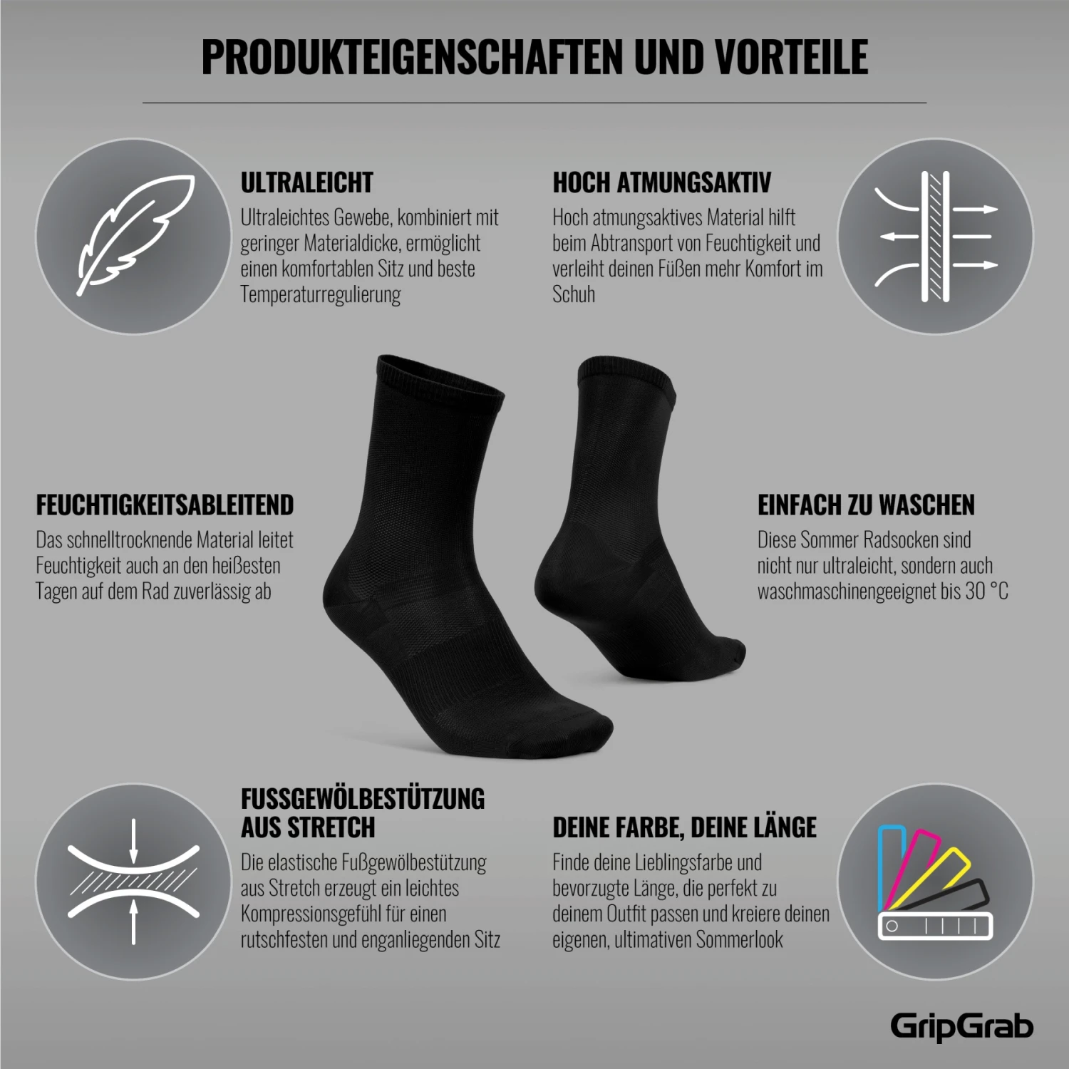 Die GripGrab Lightweight Airflow Socken sind der ideale Begleiter im Sommer und an warmen Tagen auf dem Rad – sie sind deine erste Wahl, wenn die Sonne den Asphalt zum Schmelzen bringt und der Anstieg vor dir nicht enden will.Die hoch atmungsaktiven Airflow Open-Mesh Zonen ermöglichen eine außergewöhnlich gute Luftzirkulation, während die Coolmax® EcoMade Faser Technologie Feuchtigkeit von deiner Haut optimal abtransportiert und temperaturregulierend wirkt.Designt mit einer eng sitzenden Fußgewölbestützung aus Stretch, vereinen diese Radsocken Performance und Komfort.Wenn du auf dem Bike alles gibst, sollte dir deine Bekleidung dabei nicht im Weg stehen. Die GripGrab Lightweight Airflow Socken sind dank ihrer federleichten Konstruktion kaumspürbar und du kannst dich voll auf den nächsten KOM oder die wunderschöne Landschaft konzentrieren.Dank des dezenten Logos und der Auswahl zwischen 10 verschiedenen Farben komplettieren die GripGrab Lightweight Airflow Socken jedes bestehende Outfit oder GripGrab Accessoire.