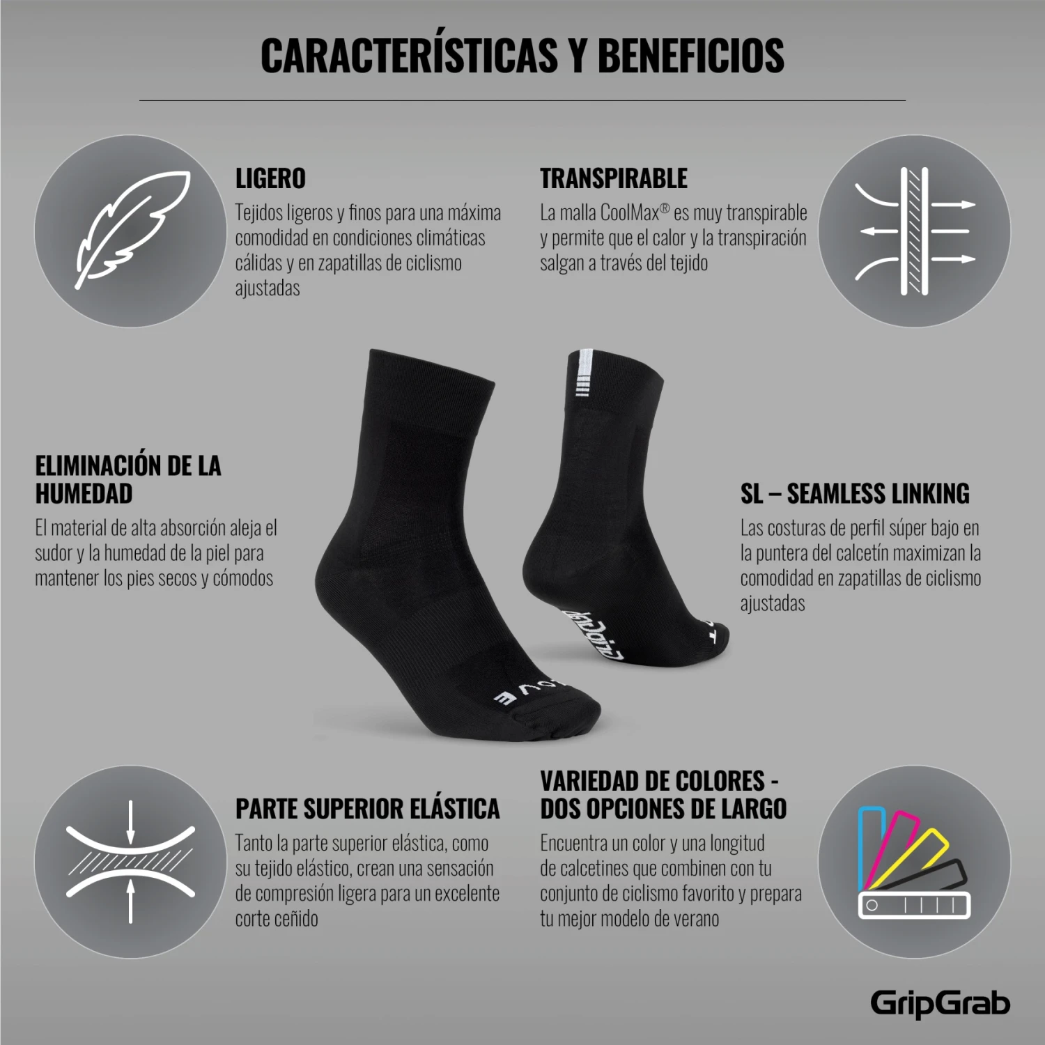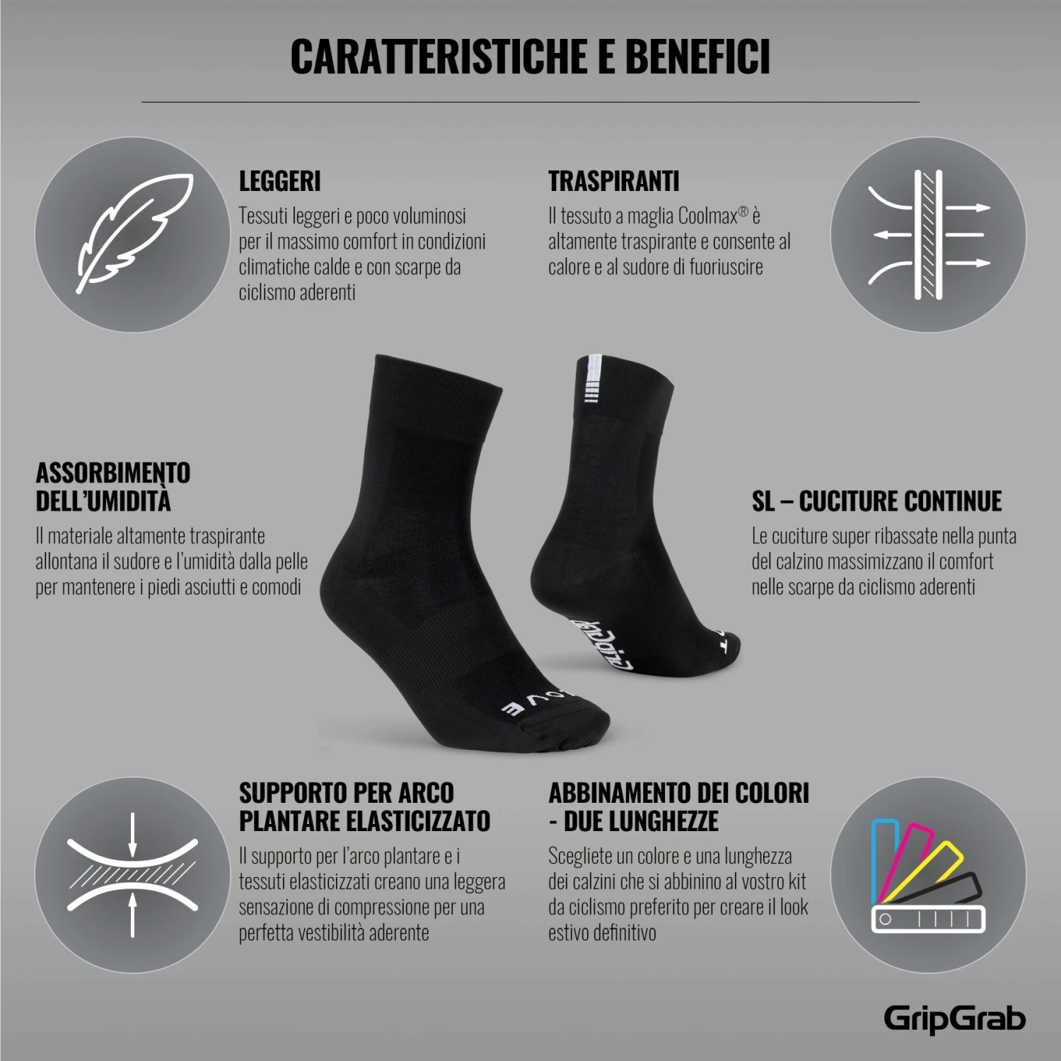 Die GripGrab Lightweight SL Socken bieten an wohligen Sommertagen Komfort und Stil. Sie bestehen aus einem leichten und atmungsaktiven Coolmax®-Material mit einem dezenten Logo und sind in einer Vielzahl von Farben erhältlich – so kannst du sie perfekt an dein Sommer-Radoutfit oder einfach an deinen Stil und deine Stimmung anpassen.