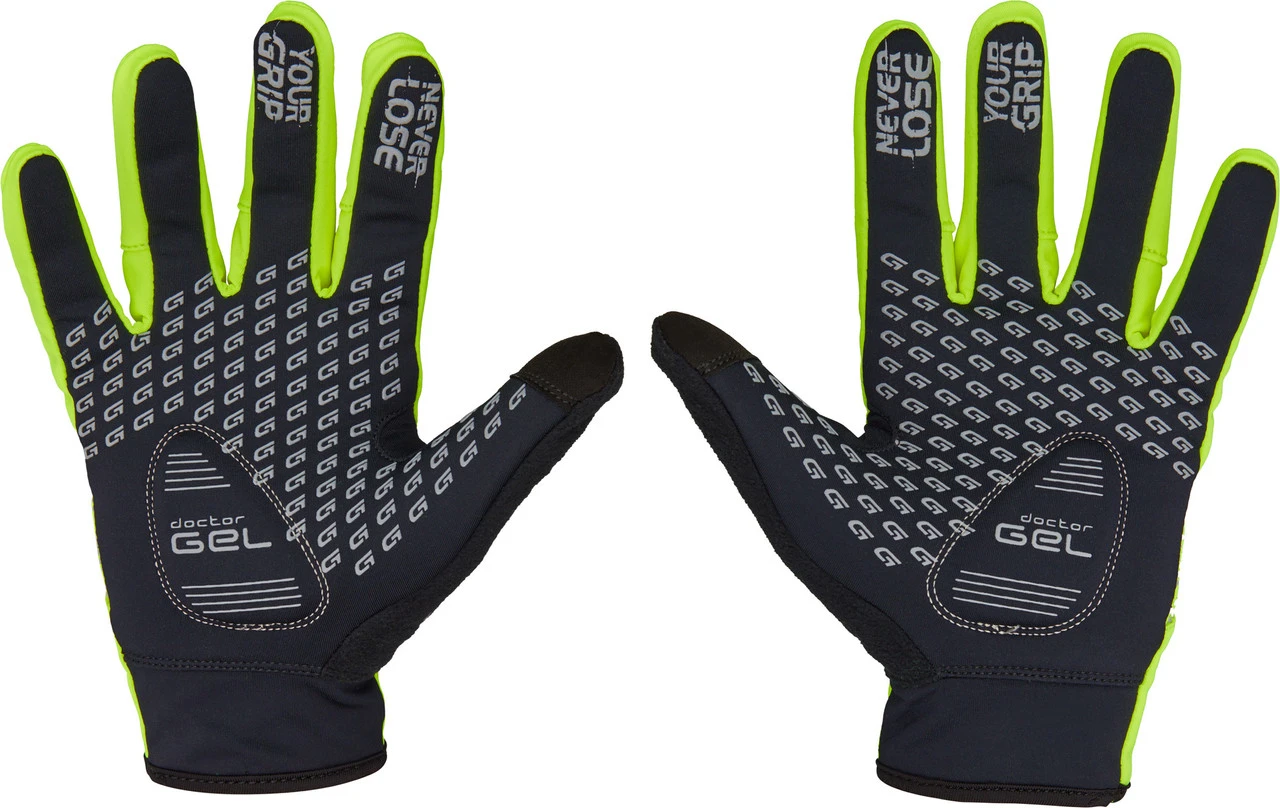 Features:4 mm DoctorGel® Polsterungreflektierende Grafikenverstärkter Grip dank Silikonprints auf der HandflächeTouchscreen-Kompatibilitätwinddichtatmungsaktivmittlerer RegenschutzFrottee-Einsatz am DaumenTechnologien:DoctorGel®: