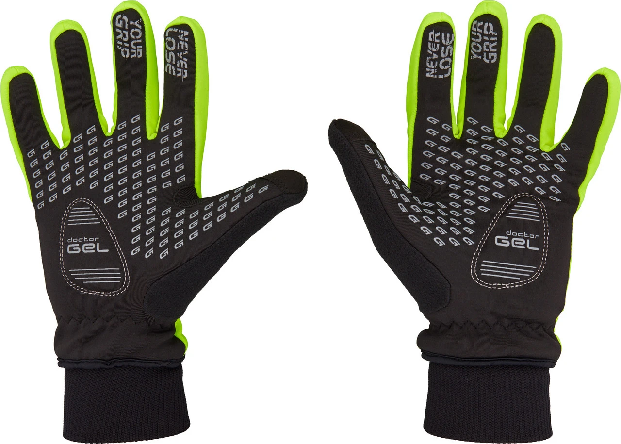 Spezifikationen:Einsatzbereich:MTB / Trekking, RoadAusführung:Ganzfinger-HandschuhePolsterung:DoctorGel® Polsterung, 4 mm dickFeatures:hohe Sichtbarkeitverstärkter Grip dank SilikonprintsTouchscreen-kompatibelFrottee-Einsatz am Daumenwinddichtatmungsaktivmittlerer Regenschutzreflektierende DetailsMaterialzusammensetzung:95 % Polyester, 5 % Polyamid